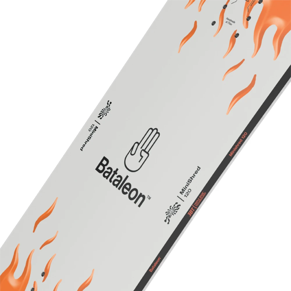 Low camber – Dit snowboard heeft een low camber. Dit kan je zien aan de kromming van het board en de lichte stijging tussen nose en tail. Wanneer je op deze Bataleon Minishred snowboard gaat staan krijg je een uniforme druk over de hele plank, van nose tot tail. Hierdoor krijg je een optimale grip en kracht.