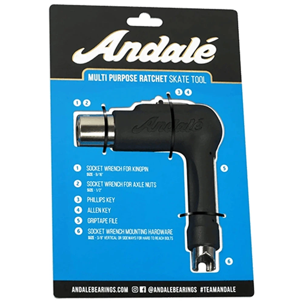 De Andale Multi Purpose Black Ratchet Skate Tool Black is een zeer complete skateboard tool om alles aan je skateboard af te stellen. Door de exclusieve hardware ratchet is het zeer gemakkelijk om vijzen aan te draaien. Er zit zelfs een precisie vijl bij om de randen van je griptape smooth te maken.