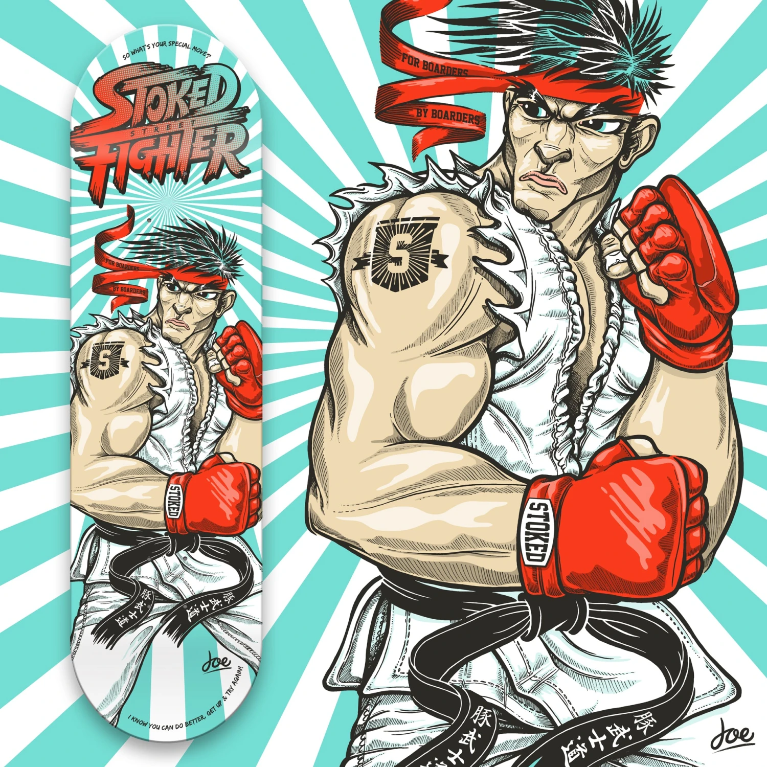 Het Stoked Street Fighter Blue Skateboard Deck werd gemaakt door de Stoked Board Co. boarders voor boarders. It is time to fight for your right to skate met dit eerste skateboard deck uit onze Stoked Street Fighter collectie. Laat je inspireren door de kracht en het doorzettingsvermogen van deze Street Fighter uit dit awesome ontwerp van Stoked Designer Joe Robinson.
