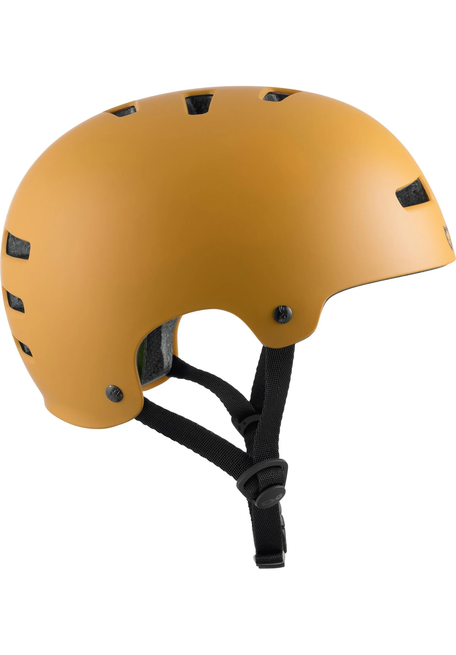 De TSG Evolution Solid Colors Satin Yellow Ochre Helm beschermt je hoofd bij zware crashes en garandeert een unieke kwaliteit. Een heel stevige ASB-buitenkant werd perfect vormgegeven om op ieders hoofd te passen. Het slank profiel blijft goed zitten, zonder te verschuiven of te schudden. De ventilatiegaten zorgen voor afkoeling tijdens het skaten. De comfortabele kussens kan je aanpassen naar gelang je maat, je kan ze er ook uitnemen en wassen.Â