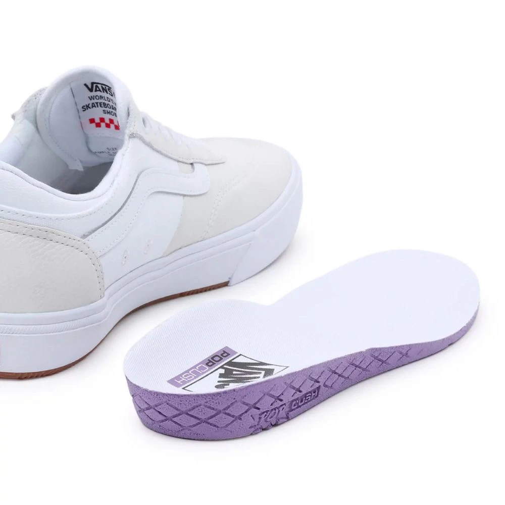 De Vans Gilbert Crockett Leather White is het pro model van Gilbert Crockett. Deze skateschoen heeft een bovenwerk van stevig leer en canvas met Duracap™-verstevigingen op slijtagegevoelige plekken voor ongeëvenaarde duurzaamheid. Dankzij de nieuwe popcush™-binnenzool heeft de schoen superieure demping en impactbescherming. Daarbij biedt de revolutionaire Wafflecup™-constructie de ondersteuning van een cupzool, waarbij de grip en het boardgevoel van een traditionele gevulkaniseerde schoen behouden blijven.