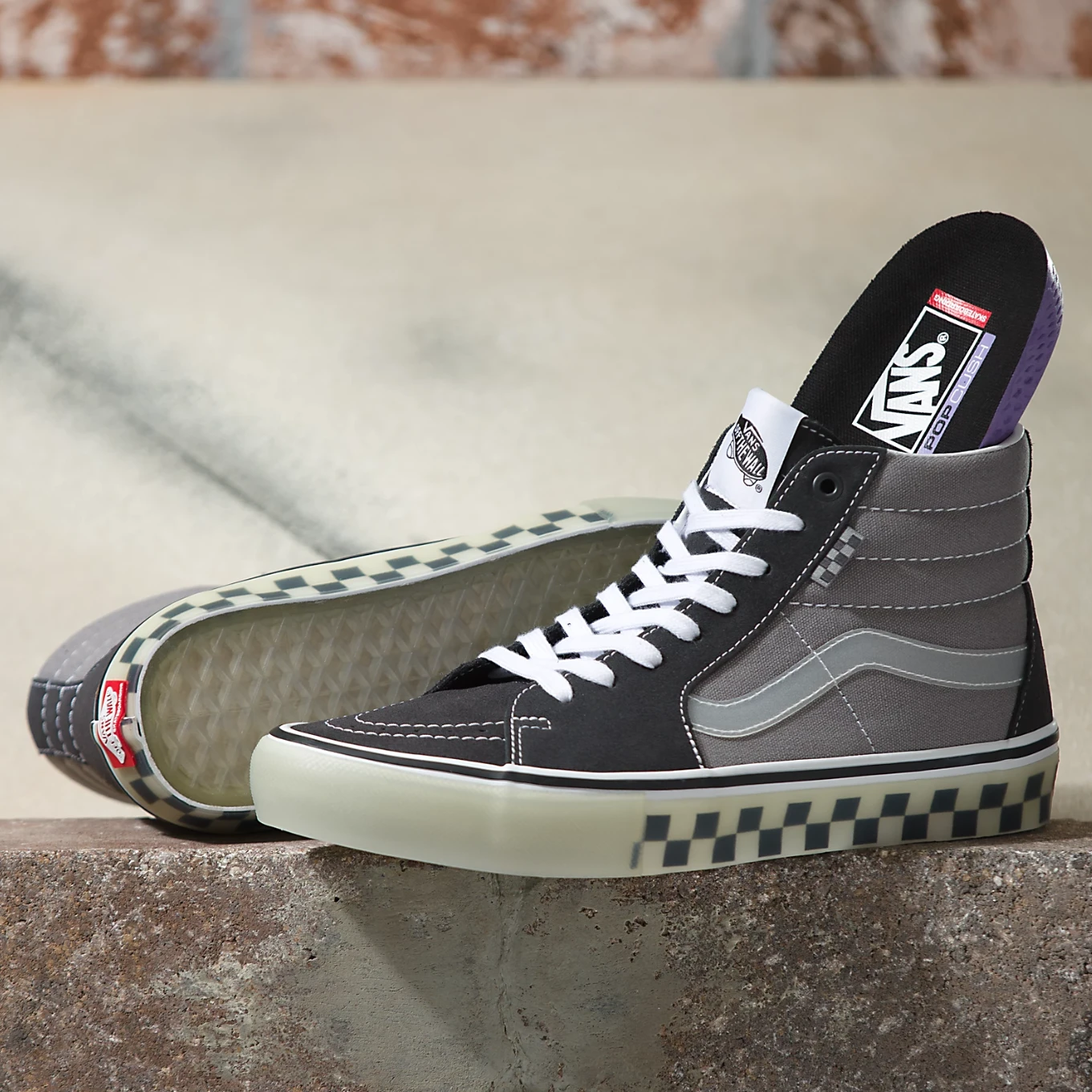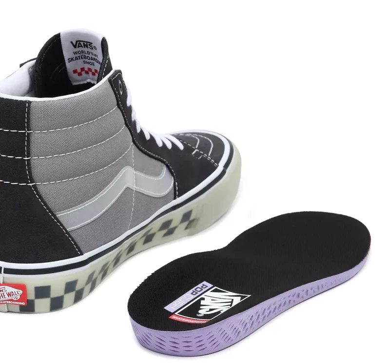 De vernieuwde Duracapâ„¢-versterkte onderlagen en het volledig vernieuwde bovenwerk, gecombineerd met een nieuwe tweedelige foxingtape en een dieper kartelpatroon op de neus, maken de nieuwe Translucent Skate Sk8-Hi duurzaam genoeg om dagelijks gebruik tijdens skateboarden te weerstaan. De nieuwe voorgevormde hielkap en interne tongbanden houden je voeten stevig op hun plaats voor meer boardcontrole. Zelfs de gumrubberen zool van Vans is verbeterd met de Sickstickâ„¢-rubbersamenstelling, voor meer grip en boardfeel. De Popcushâ„¢-binnenzool met energieteruggave biedt superieure demping en impactbescherming en helpt vermoeidheid van je benen te verminderen tijdens langere skatesessies. De verstevigde binnenkant van de hiel biedt meer ondersteuning en stabiliteit.